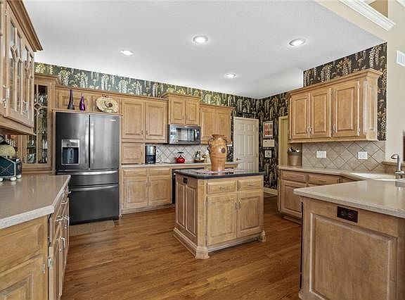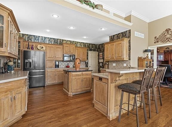 Lovely, meticulously-maintained Julian 1-1/2 sty on treed walk-out lot! Great floor plan for entertaining or sheltering--much space! Oversized composite deck, view trees. First floor has primary bedroom (with see-thru FP to newer bath), door to deck, & terrific closet (spacious)! First floor also has convenient office with built-ins. Formal dining with hutch inset and hardwoods! Generous kitchen w/ lots of cabs, island, walk-in pantry and hearth room=view trees. Upstairs has 3 bedrooms (walk-in closets, cedar closet) AND LOFT. Lower level (walks out to patio and trees!!) with jumbo Rec room, exercise room, wet bar, extra-large office (can be 5th bedroom w/walk-in closet!). MANY Closets and built-ins throughout! Suspended garage with HUGE storage spaces! Actual garage door from LL to back patio=convenience! Newer comp roof & gutters. Many upgraded features. Re-bricked front porch= curb appeal! Pictures of backyard with trees were taken 8/2021 to show privacy. Riss Lake HOA includes 3 pools, splash park, tennis, trails, basketball, pickle ball, lake privileges with fishing, many homeowner activities! Sq footage and taxes are approximate and should be verified by Buyer's agent. 2022-01-14
