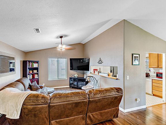 Great starter home or investment!! Floorplan features open sightlines with spacious vaulted living room, kitchen and dining. Newer laminate floors run throughout the entry, living, dining and hall. Guest bath was just updated. The kitchen has a nice sized pantry, plenty of cabinetry and newer range and hood. Slider leads you out to your covered back deck with mountain views and private back yard with timed sprinklers and garden bed.