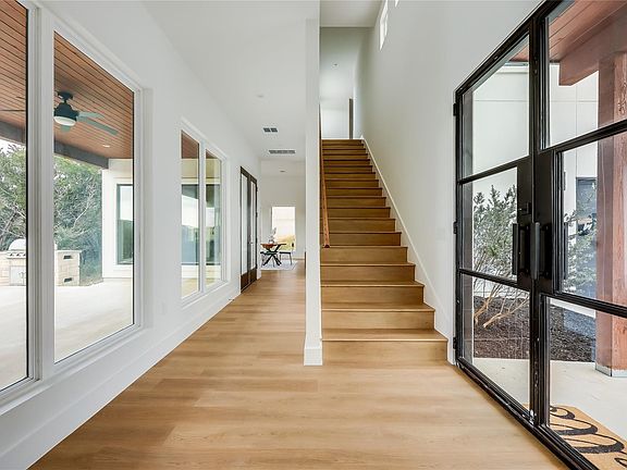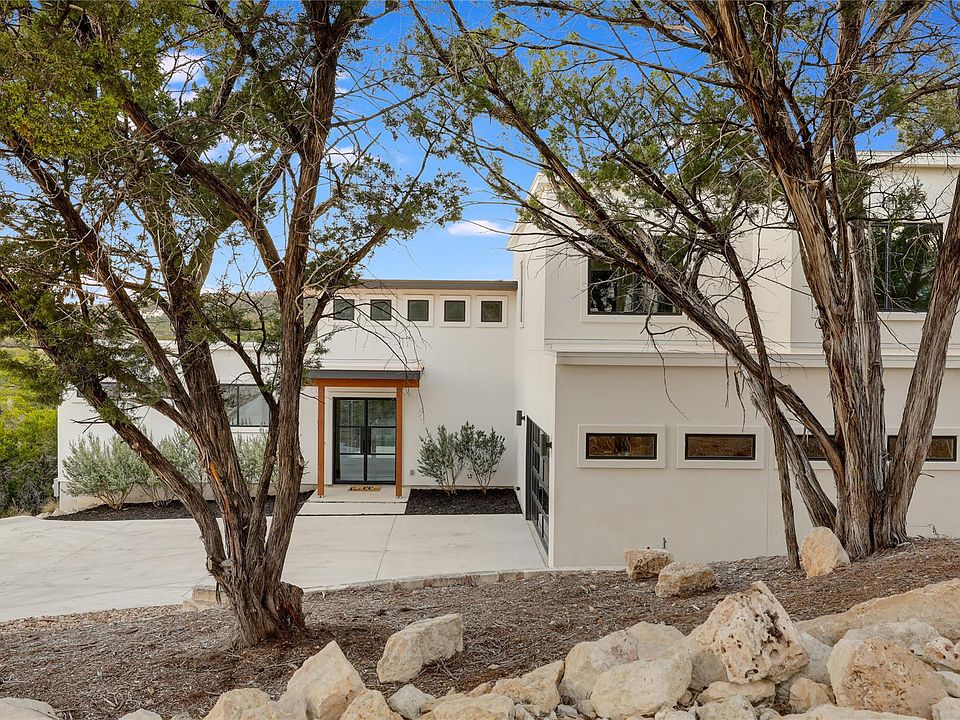 This modern custom home delivers sweeping Texas Hill Country and treetop views from an oversized outdoor deck and covered cedar-ceiling patio with fan and built-in grill station. The open, light-filled floor plan features walls of windows that capture endless big-sky scenery. The chef-inspired kitchen offers a large center island and seamless flow into living and dining, ideal for everyday comfort and entertaining. The tranquil setting is framed by masonry retaining walls, native trees, ridgelines, and minimal traffic for added privacy. The primary suite includes a spa-style ensuite bath with a soaking tub inside the walk-in shower, dual vanities, and modern finishes for a sleek, calming retreat. The spacious primary closet conveniently connects to the laundry room. Three additional bedrooms and a second living area is upstairs. Lago Vista POA membership unlocks private Lake Travis access and resort-style amenities including pools, fitness center, fishing well, tennis, pickleball, waterfront parks, picnic pavilions, trails, boat ramps, and sport courts. Located ~30 minutes to Cedar Park, 40 minutes to Marble Falls, and under 1 hour to downtown Austin. A rare mix of striking design, privacy, and elevated lifestyle.