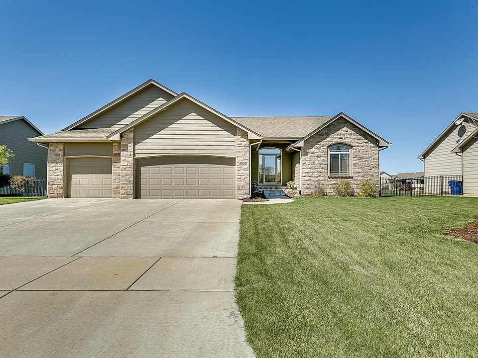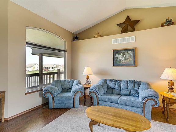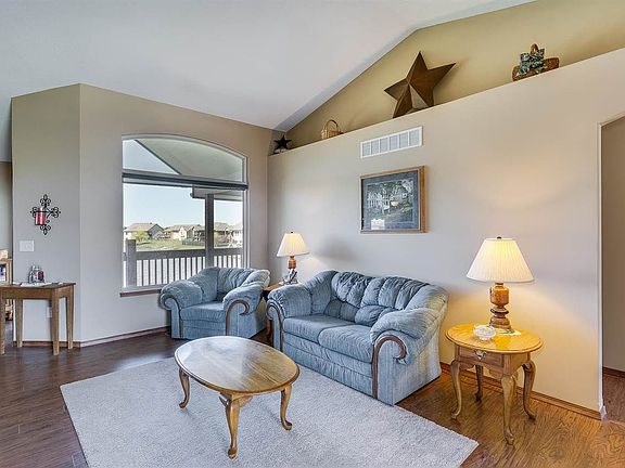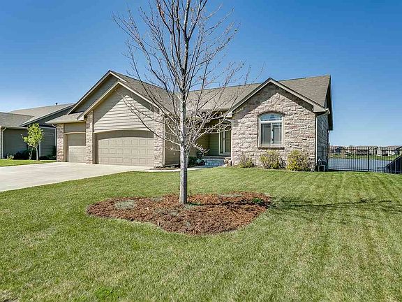 A must see home in Maize School District. This lake lot has an awesome view of the sunsets! Sit on the large covered deck and enjoy the view. The main floor has 3 bedrooms and 2 full bathrooms. Laundry room is a separate room connecting the kitchen to the master bathroom. There is additional space in the laundry room for storage shelves. Walk in pantry off the kitchen. New hardwood floors were installed Nov 2016. The basement has a large family room& rec room with additional bedroom and full bathroom. Stay safe during storm season in the 10x5 storm room. Walk out basement welcomes you to a manicured yard with well & sprinkler system. Cozy up by the fire pit as you watch the sun set from the back patio.