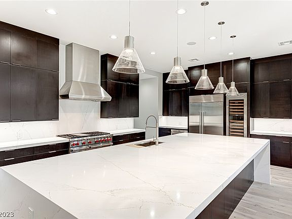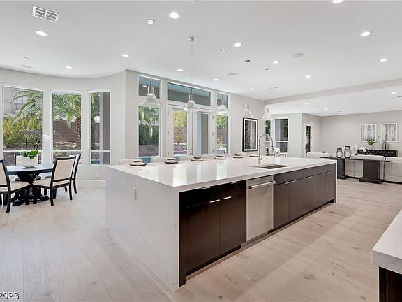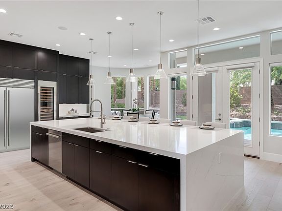 Stunning completely renovated custom estate, recently showcased in the Las Vegas RJ. Located in one of Summerlin's most exclusive guard-gated communities. This two-story, 5,700+ SqFt. home features 5 bed/6 bath: luxurious primary bedroom with an attached gym or nursery, three en-suite bedrooms, dual laundry rooms, a downstairs office space, and a next gen-suite with a kitchenette. Natural light radiates through the space, as oversized windows dominate the home. This home impresses with a “chef’s dream” kitchen, which features custom cabinets, quartz countertops, an oversized island, a walk-in pantry with 2 GE monogram refrigerators, a wolf 6 burner range with infrared griddle, a sub-zero 48 inch side-by-side refrigerator and freezer, and a full-size sub-zero wine refrigerator. Exquisite rooftop deck offers 360-degree views of the city, which is perfect for entertaining, and the private backyard offers a more intimate atmosphere with mature landscaping and an impressive pool and spa.