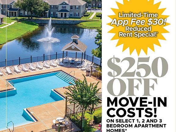 - Special offer! $250 OFF Move-In Costs on Select 1, 2 and 3 Bedroom Apartment Homes* For a Limited Time, App Fee is only $30! *Must move in by 11/14/25. Restrictions apply, contact leasing office for details.