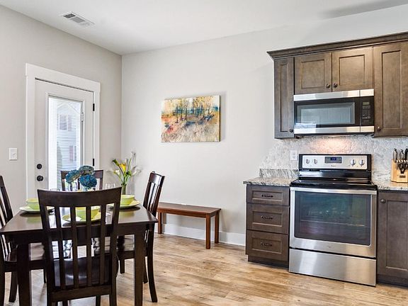 The kitchen is equipped with pots and pans, utensils, bakeware, a toaster, a Keurig, a convection oven, stainless steel appliances with granite countertops, and a stunning sliced stone tile backsplash that finishes at the ceiling. The dining area is connected to the kitchen and seats four normally, but a chair can be removed and the provided bench seat can be added to cozily seat five.