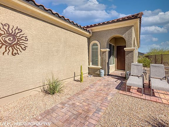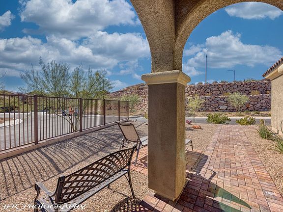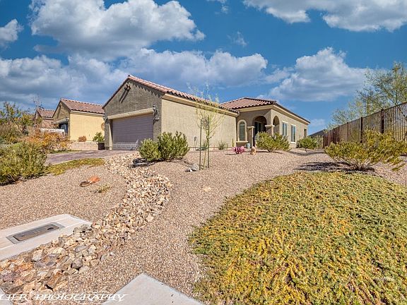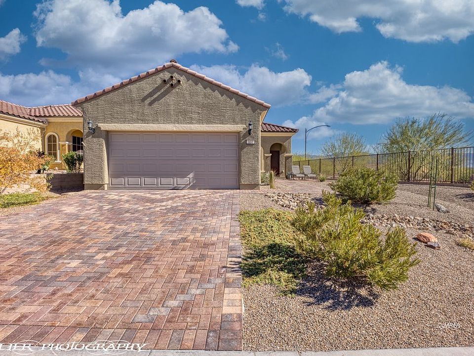 Built in 2018 with lots of natural light, this beautiful Daisy model boasts an eastern exposure of the virgin mountain from the elevated corner lot. The driveway has been enhanced with Sierra Blend brick pavers that continue along the walkway path to a lovely sitting area. Upon entry you feel welcomed by the warm and inviting color palette with tile flooring laid throughout the house. The kitchen does not disappoint with upgraded granite countertops, whirlpool stainless steel appliances and bar height seating for casual dining. Large master bathroom with double vanity, roomy walk-in closet with custom shelving and upgrade tile shower. Plenty of storage throughout the house with additional shelving in the laundry room and oversized garage with 4 ft. extension. Whether it's enjoying the captivating evening sky from your hot tub or relaxing in the beautifully appointed outdoor seating area with mountain views, this home is ready for you! Sun City Mesquite is a golf resort style 55+ community with full service amenities.