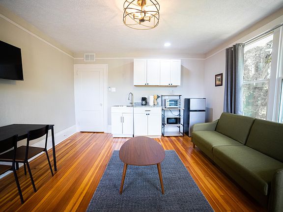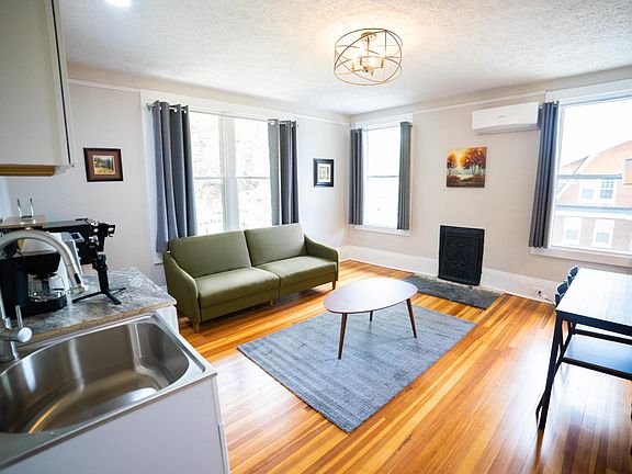 This apartment unit has refinished hardwood flooring, large windows, a bathroom with a custom tile shower/tub combo, and living room space. The unit comes fully furnished with a queen-size bed, dresser, sofa, and a flat screen television. A the living room has a kitchenette with a dinette table. Private access to heating and air conditioning. There is access to a spacious kitchen, laundry and dining area on the main level. Owner pays for all utilities (electric, gas, water, trash, Wi-Fi, lawn maintenance, and pest control). No smoking allowed in the house. Each unit has one parking spot.