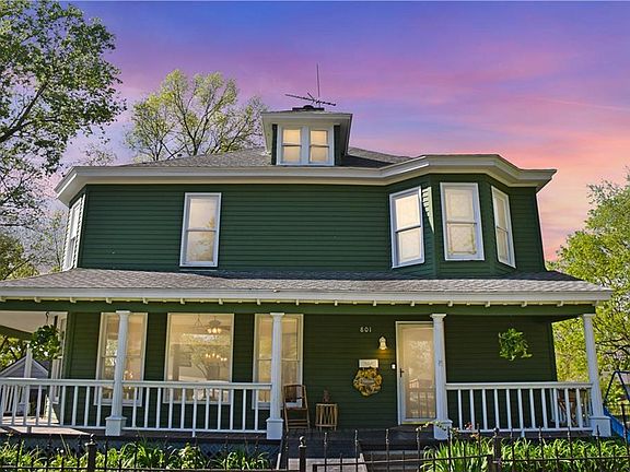 Step Back in Time... This Victorian Gem is conveniently located walking distance from the historic downtown square of Harrisonville! The owners have painted the interior/exterior, installed new flooring in entryway, living room and laundry room. This spacious home features 5-bedrooms, 3-bathrooms, den/office with built in custom bookshelves, formal dining room, formal living room with fireplace, family room, eat-in kitchen, off kitchen laundry room, mud room, covered wrap around front porch, ornate wrought iron fence and gate, charming backyard with entertaining deck, several fruit trees and raised bed planters as well as secured off-street parking. Refrigerator, dishwasher, oven/stove to remain with the home as well as Ring security.