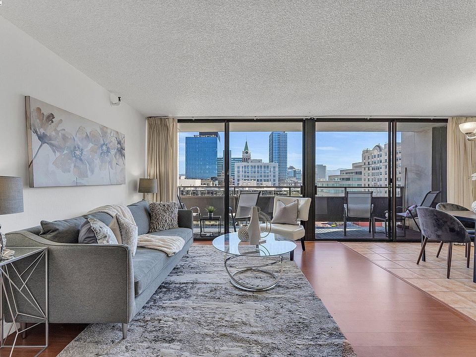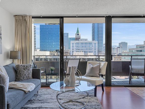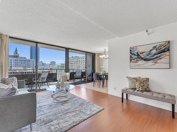 Welcome to Oakland City Center! This spacious home is where you can enjoy panoramic views of the Oakland skyline from your own spacious balcony, living room and bedrooms. This Two Bedroom one and a half bath unit filled with natural light throughout and features in-unit laundry. The updated kitchen with gas cooktop and refrigerator is sure to meet all your cooking needs. Other amenities include a sizable storage room in the unit. HOA fee includes water, hot water, garbage, gas, common area lounge, roof garden, plenty of outdoor spaces available for exercise and enjoy the sun. There is also 24 hour lobby staff and secured underground parking with one assigned parking space conveniently located. All of this in a great location near BART, shopping, dining freeway and Jack London Square ferry access.