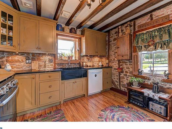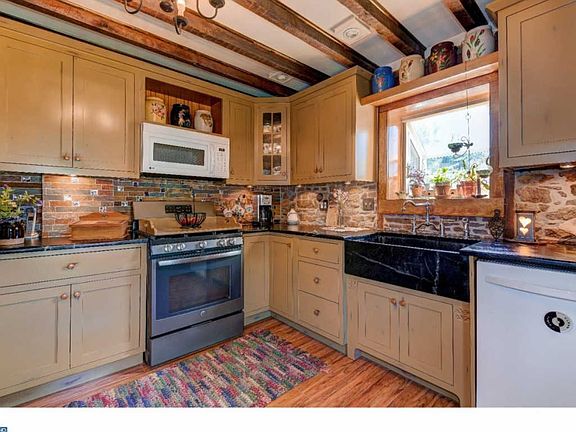 Welcome to this absolutely stunning and fully restored Lansdale farmhouse built in 1890. If you are looking for a property with character look no further. Driving up to the home you will notice that no detail was left untouched. You can truly tell when someone loved their home and took excellent care of it. The siding looks as if it were installed yesterday as well as the roof. In the front of the property you will notice the cute sitting porch surrounded by beautiful landscaping and a wonderful setting. The kitchen is screaming with remarkable features from its soapstone sink and countertop to the slate and glass backsplash. Other features include gas cooking, stone walls, soft-close custom cabinetry, hardwood floors, garden window and exposed wood beams. In the dining room we also have exposed beams, a door that leads out to the front sitting porch, a large entrance into the living room and gleaming hardwood flooring. The living room is complimented by hardwood flooring, a brick wood burning fireplace and a finished wood ceiling. The first floor powder room and laundry area have been newly renovated with a custom made vanity, new toilet, and wainscoting. On the 2nd floor we have hardwood flooring completely throughout leading into three charming bedrooms. The 2nd bedroom is complimented by a large skylight and built-in shelving. The bathroom has been fully remodeled with decorative wainscoting, exposed beams and custom vanity with a granite countertop. Moving onto my personal favorite part of the home which is the back yard. It is here that you will find the porch of all porches. Talk about a nice area to spend your time. The porch features a finished wood ceiling with recessed lighting and ceiling fan and exterior stone wall walking down to a E.P-Henry paved patio, stone pond and sitting area. The patio adjoins the massive oversized two car stone front detached garage to hide away the finest of automotive toys. In addition to all of these wonderful exterior features it also has two lovely wooden garden sheds and boarders a retirement home that is nothing but a giant field for added seclusion. The back yard as well as the entire property has been completely landscaped to absolute perfection. Make no mistake about it, this home will go fast so make an appointment today. I promise you will not be disappointed!