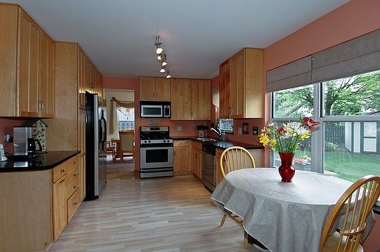 Excellent location...make this your new home. Vaulted living room, spacious dining room, updated kitchen w/solid surface countertops, stainless appliances, maple cabinets, open to family room w/fireplace, master suite with private bath, 2 additional bedrooms on 2nd level, finished bsmt rec room 20x15, 16x10 den, 2 car garage, beautiful landscaped private fenced yard, perennial gardens, shed, patio,roof & siding 2007