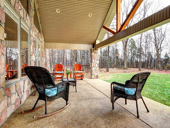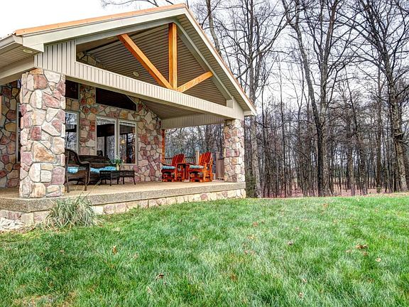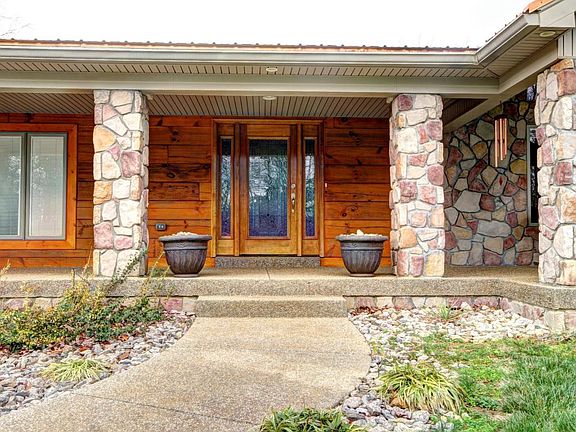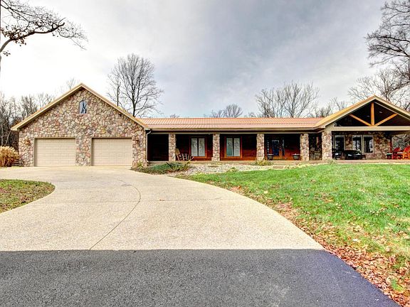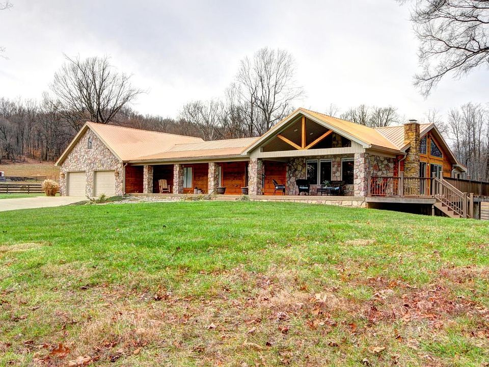 Everyone dreams of their cabin in the woods! Don't miss your chance to own a piece of paradise with this luxurious real estate! Wooded privacy with unparalleled views! In this setting you can still be at Louisville airport in only 22 minutes! The enchanting beauty of this acreage is unsurpassed. Wildlife roams freely, Sit on the nearly 70 foot long front porch and count the deer! This walk out ranch exterior is log, stone, and vinyl.The interior of this home is designed to bring the outdoors in! Framing the panoramic exterior views are windows, with built in blinds, an enclosed heated and cooled sun room, and, an expansive open floor plan that will fit your families lifestyle perfectly! The warm exposed wood from floor to ceiling and the beautiful stone fire place offer a cozy feel to