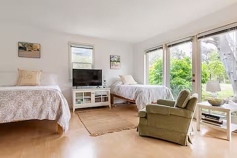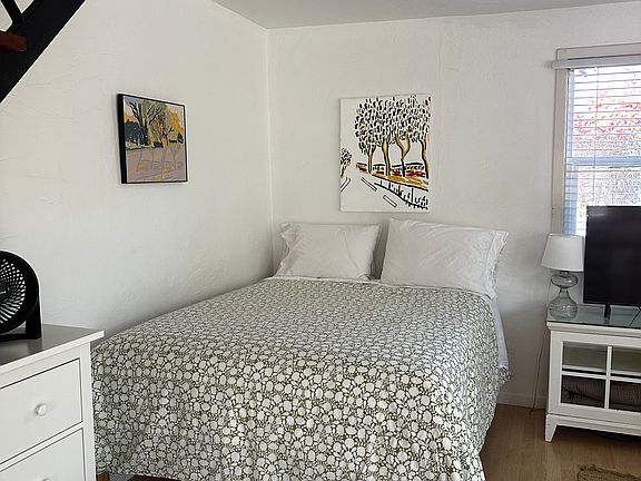 Pied de terre on Rodeo Drive. Detached Studio behind Craftsman house, built in 1913. Historic landmark. The main house was once home to Joseph Kennedy when he temporarily re-located to Hollywood to buy a film studio. Since 1941 this grand old estate has been owned by one family: the Blums (now the Blum-Herds). The apartment is one large room, fully furnished. Roomy, comfortable, full of light and casual. A wall of French doors open to a half-acre garden. Hardwood floors throughout. The apartment is not luxurious but it is full of character. Great location: safe, tranquil and central to many neighborhoods like West Hollywood, Westwood and Santa Monica. Within walking distance of all shops and restaurants in downtown Beverly Hills. For a tenant moving in, this would be a turn-key experience. All linens and kitchen utensils are provided. HomeOwners live on-site.