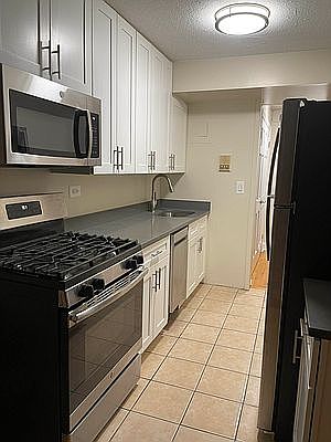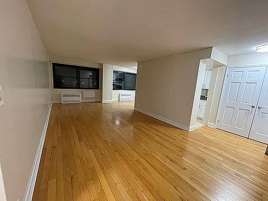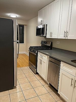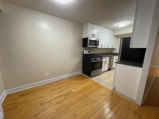 Beautiful studio apartment with stainless steel appliances, microwave, and elegant white wooden cabinets. This lovely unit features wooden floors and plenty of closet space.