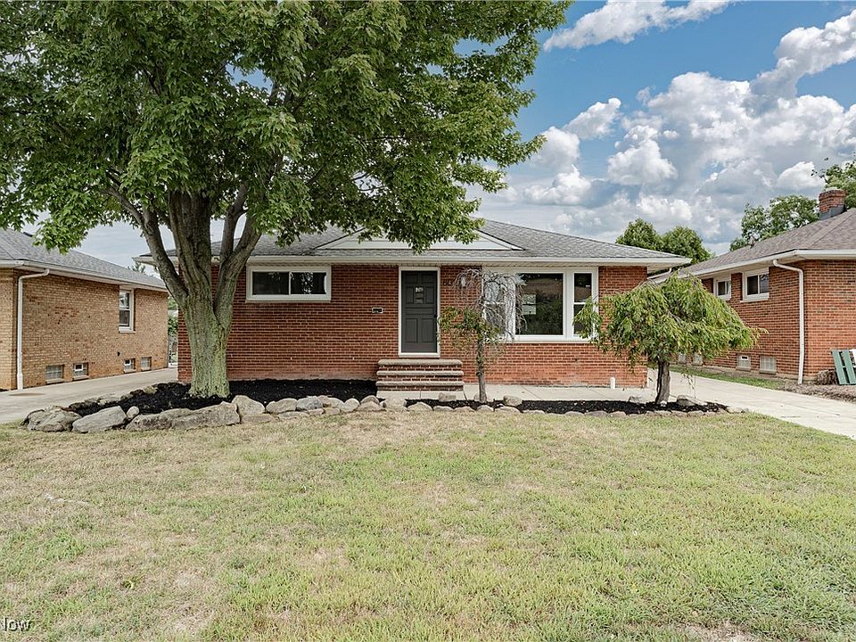 The home offers three inviting bedrooms with fresh carpeting and a spacious family room at the rear, highlighted by a brick accent wall and a warm fireplace—perfect for relaxing or entertaining. A fully updated main floor bathroom completes the first level.