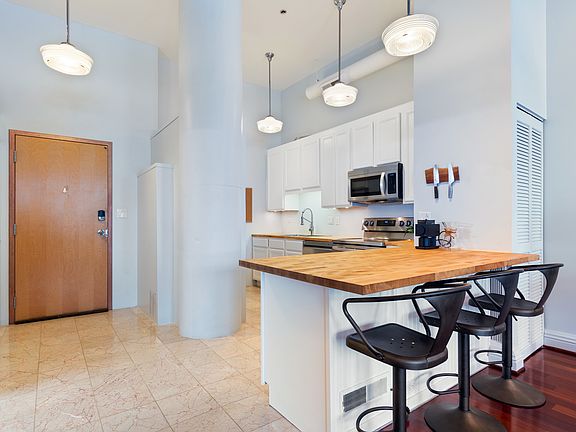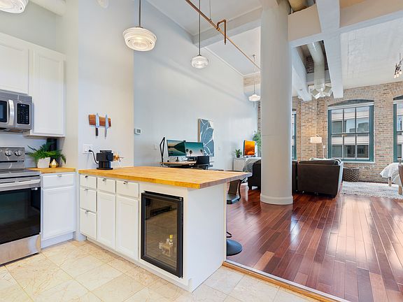 Welcome to this 1 bedroom penthouse with 14 ft. ceiling heights, and includes a bonus loft space. Right under $25k in upgrades, this loft is move in ready. Entering the home, your eye is drawn to the East wall of oversized windows on the other side of the open floor plan. Speaking of the windows, enjoy the Lutron Roller Shade system to lower or raise shades with an app on your phone. The kitchen includes newly installed butcher block countertops, new sink/faucet, newly painted cabinets and 2022 LG stainless steel appliances. The bath also was improved by adding butcher block countertops as well, new sink and painted cabinets. There are hardwood floors throughout the versatile open floor plan, which includes a dining room, living room, workspace and bedroom area. The bedroom above the bath could be used as a guest room, storage or den. The building includes a laundry, an exercise room, bike room and a storage cage. Permit parking on street and parking lot options are in area. Professionally managed and awesome engineers/ maintenance staff. Steps from the Southbank River Walk. Walk to lake, loop, museums, shopping nightlife and great restaurants. Permit parking on street and parking lot options are in area.