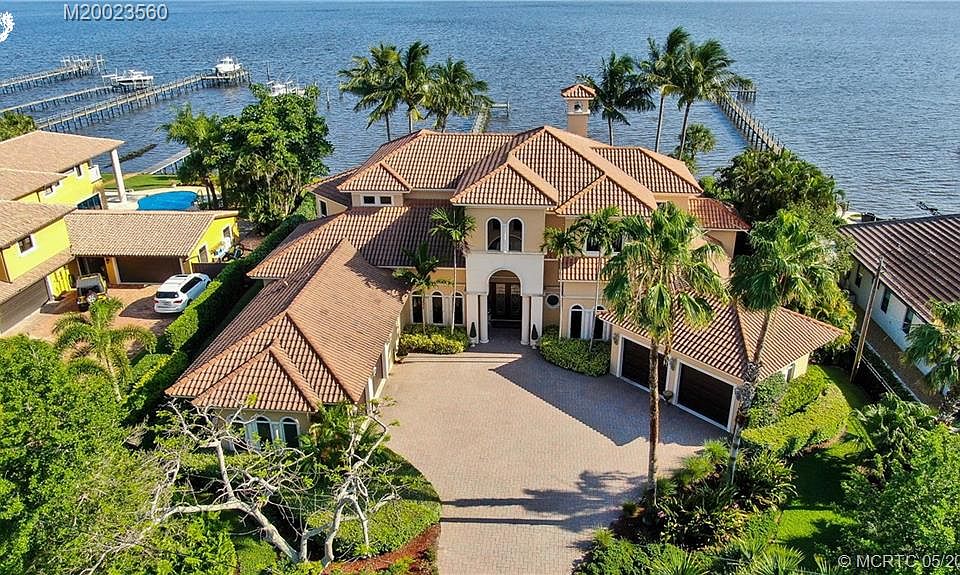 This elegant waterfront is perfectly nestled on the banks of the wide St. Lucie River, with stunning panoramic water view of Stuart. Built in 2003, this masterpiece blends luxury and practicality seamlessly. Soaring 2-story ceilings in the main living space, and high end natural finishes. The floor plan fits the modern lifestyle with an open feel from the open kitchen, and downstairs master suite with oversized closets and spa like master bath. In addition to the five bedrooms, there is a dedicated office, a bonus room AND for media buffs, an amazing two-level cinema room. Impact glass, concrete construction, solid core doors, and garage for four cars round out the most important features. Outside, find almost 130 feet of direct waterfrontage on the .68 Acre lot, a dock, summer kitchen, and sleek infinity edge pool. Located in the desirable Hildabrad Park neighborhood, this home offers the very best of Stuart with close proximity to Downtown Stuart Dining.