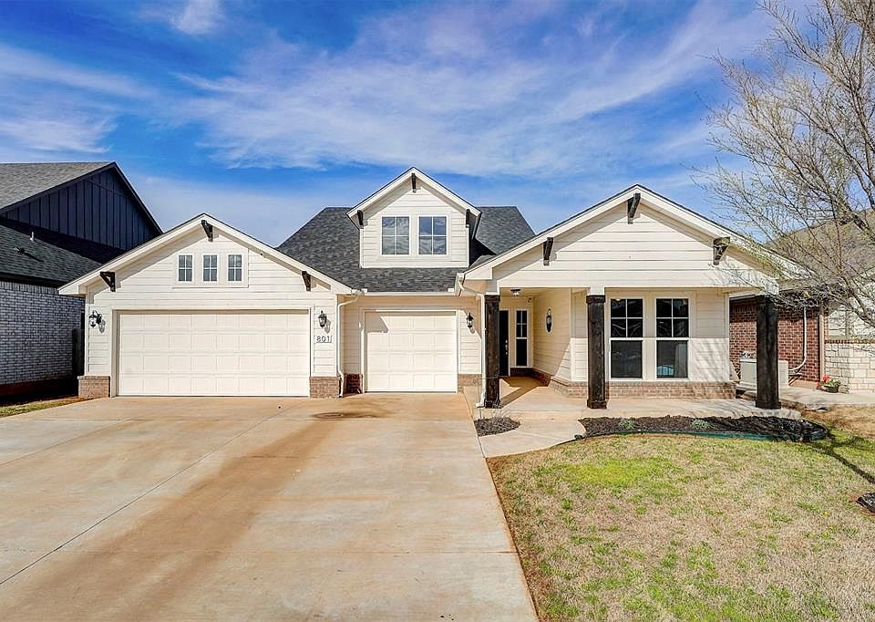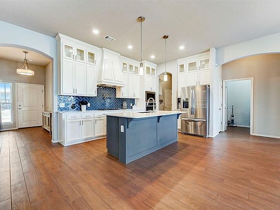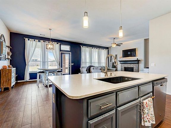 Welcome to the pinnacle of luxury living in the sought-after Somers Pointe community. This 3 Bedroom, 2 Bathrooms, plus an Office home is the perfect blend of elegance and comfort. Located on a large lot with an amazing backyard space, As you step inside, you'll be greeted by a spacious open floor plan flooded with natural light, creating a welcoming and bright atmosphere. The living area features a beautiful stone fireplace, adding warmth and charm, perfect for gatherings with loved ones. The kitchen is sure to impress with its stylish design, including a striking blue accent island with seating, surrounded by cabinets reaching the ceiling, adorned with glass fronts for a touch of sophistication. The lovely blue backsplash adds a modern touch, complementing the sleek stainless steel appliances and pristine countertops. The thoughtful layout includes a split floor plan, providing privacy and tranquility. On one side, you'll find the luxurious primary suite and a serene study, while two bedrooms are situated on the other side. The primary suite boasts large windows, an ensuite bathroom with a double vanity, a soaker tub, a standalone shower, and a spacious fully upgraded walk-in closet. Outside, a sprawling covered patio extended with pavers invites you to enjoy outdoor dining or relaxation. A fire pit in the backyard creates a cozy ambiance for evenings under the stars. Additional features include a garage extended by 2 feet and equipped with a storm shelter for added safety. Nearby amenities include a central park with playgrounds and pavilions, offering endless outdoor enjoyment. Plus, convenient access to shopping and dining options on Garth Brooks Blvd makes life a breeze. Don't miss the chance to experience luxury living at its finest. Schedule your private tour today and make this remarkable property your own.