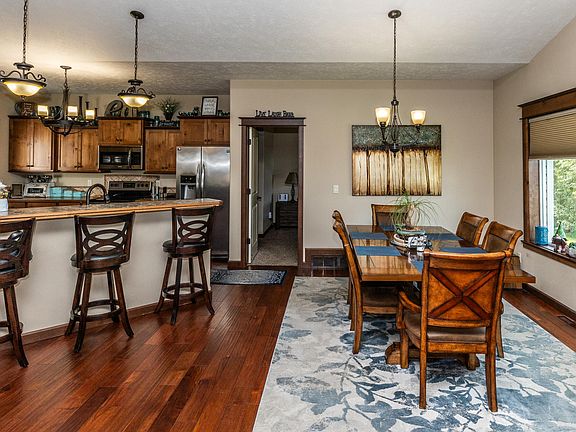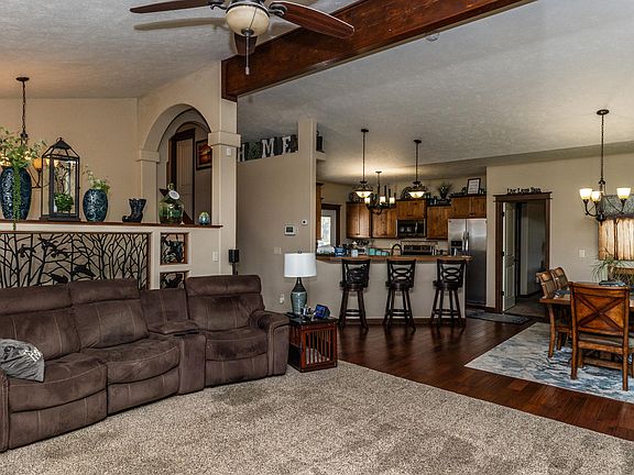 As you enter through the front door, you'll immediately notice the quality and attention to detail that defines this home. The open floor plan invites you into a spacious living area with abundant natural light, perfect for both relaxing and entertaining. The stone fireplace is the focal point of the living room along with a vaulted ceiling and center beam. The gorgeous wood floors throughout the main living area and kitchen add an elegant touch.