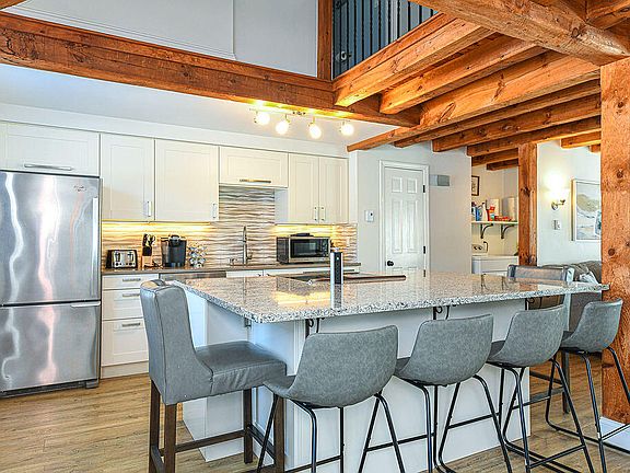 The thoughtfully designed interior showcases exposed wood beams that add character to the welcoming living space. A showstopping kitchen features a magnificent center island with seating for four, built in charging station and premium stainless-steel appliances, and abundant pantry storage. The open-concept layout creates an ideal setting for entertaining and daily living.