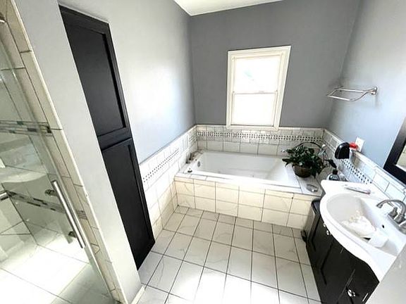 Updated Bungalow can be anything you desire: 1. large family home, 2. business use inside or outside home, 3. two family home. Zoning is ok for all 3 uses. Entrance: Nice front porch has thermopane windows, insulated walls, carpet. Living Room/Dining Room: 2 big rooms with oak floor under carpet, painted walls, open concept to dining room. Kitchen: Snack bar with white cabinets, ceramic tile counter top, glass mullions in cabinets, stove, refrigerator, dishwasher included (trash compactor not functional). Bedroom: Large bedroom was once two rooms, new drywall, ceiling and walls, carpet, closet. Bedroom: Front bedroom has painted walls, window seat, closet. Hardwood under carpet. Bath: Updated with jacuzzi tub, separate shower, white fixtures, white vanity. Luxury! Beauty Shop: Painted walls, laminate floors, huge closet with attic type storage. Patio door from beauty shop opens to gazebo and back yard. Yard totally fenced. This beauty shop can be any small business you want since zoning permits this use. Basement: This finished basement has all this: kitchenette, living room, 3 bedrooms, full bath, laundry room. You can use this as extra income to rent out because it has it's own entrance in front. OR just keep for family to use with extra bedrooms. Versatile space can be what your family needs (rental income or more bedrooms). Other: High efficiency GFA (2 years old), Central Air, 200 amp electrical service, vinyl siding, all replacement windows, separate 2 car garage enters from alley.