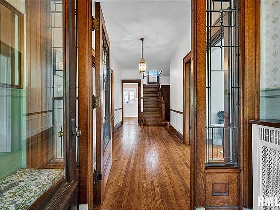 Lovingly owned by the same family for over 114 years, this stunning 1907 all-brick Four Square/Prairie-style home sits on nearly 1 acre with mature trees, countless rose bushes and lovely landscaping. Original charm preserved: quarter-sawn oak floors and fumed millwork, 8" trim, plaster walls, Roman brick fireplace, pocket doors, built-ins with leaded glass, stained glass windows, and coffered 10-foot ceilings. Formal dining room with board and batten walls and original buffet. Chef’s kitchen remodeled in 2023 with Thermador smart appliances, quartz counters, Thomasville cabinets, marble floors, deVOL faucet, and original trim. Original butler’s pantry with copper counters, hardwood cabinetry and solid brass hardware. Main floor bath with original vintage features. Upstairs is 5 beds, remodeled full bath (2022) with Onyx shower, soaking tub, marble baseboards, and dressing room. Bedroom with ornate iron fireplace, bird’s-eye maple trim and window seat. Massive walk-up attic offers expansion options. Dry, full basement with concrete floors, high-end washer/dryer (2022) and original soapstone laundry sink. 2.5-stall garage (2022), asphalt 4-car driveway (2023), roof (2017), 400 amp electric, 28000 BTU A/C unit (2022), water filtration and softener (2024), water heater (2025), professional paint in & out (2022-23). Don’t miss this rare opportunity to own a unique, stately, meticulously preserved historic home—where timeless craftsmanship meets thoughtful modern updates!