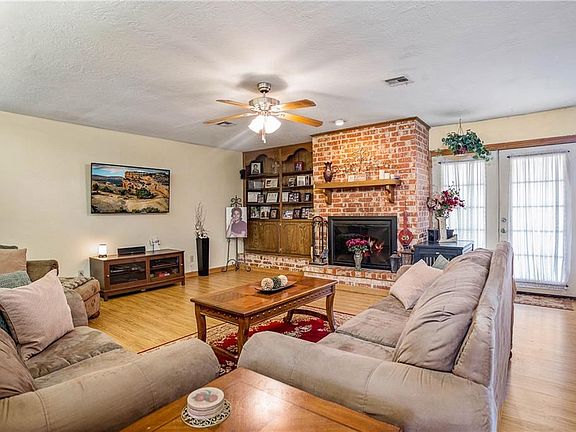 NEAT and CLEAN describes this house. It has been well taken care of and features 3 bedroom and 2 full baths. It is located is a desirable neighborhood close to the high school. No popcorn ceilings in this house!. Laminate flooring in the Living Room and Dining Room; carpet in the Bedrooms. The Living Room is spacious and features a beautiful brick, wood burning fireplace with 2 large built in bookshelves and storage on one side. The Kitchen has a lot of storage cabinets, snack bar, breakfast nook, tiled counter tops, refrigerator, and electric stove with vented hood. The Master Bedroom is very spacious and features 2 closets, one is a large walk in closet. The Master Bathroom has a privacy toilet and walk in shower. Large 2 car garage. The Backyard features a covered back patio, storage building, large yard with privacy fencing and no neighbors behind the house!.
