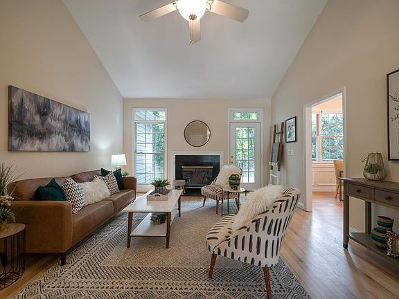 Stunning one-story, 3-bedroom, 2-bathroom home located in the sought-after Eagles Pointe community! Enjoy a friendly atmosphere and convenient access to RTP, Duke, and UNC. Take a stroll to the nearby Southpoint Mall for shopping and entertainment, or go on a hike on the American Tobacco Trail. This contemporary home boasts high ceilings, hardwood floors, and ample natural light. Relax on the deck or screened-in porch in the backyard, perfect for enjoying a summer breeze or sipping warm drinks in winter. Stay comfortable year-round with ceiling fans or utilize the 2-car garage for shelter from the elements. This home has been freshly painted, providing a crisp and inviting atmosphere. Don't miss the chance to make this house your home!