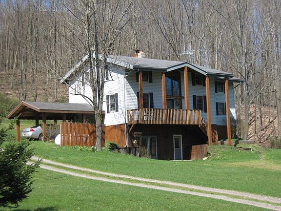 Exceptional custom built Post & Beam home w/ rustic charm. Kitchen w/large island, spacious living room w/woodstove, formal dining room. 3 good sized bedrms and open area on 2nd floor. Basement ready to finish would make great family room or additional ba & bedrm. Attached carport & detached oversized 2 car garage. REA electric 5.5 acres, your own park in a country setting. Privacy yet just minutes from 86 and 17. Located conveniently between Bath, Avoca and Hornell. Foundation type is wood.