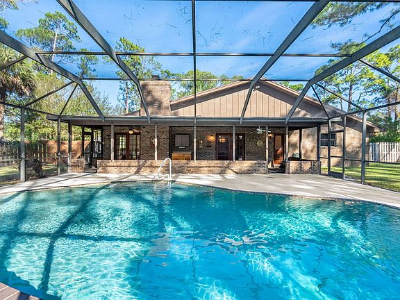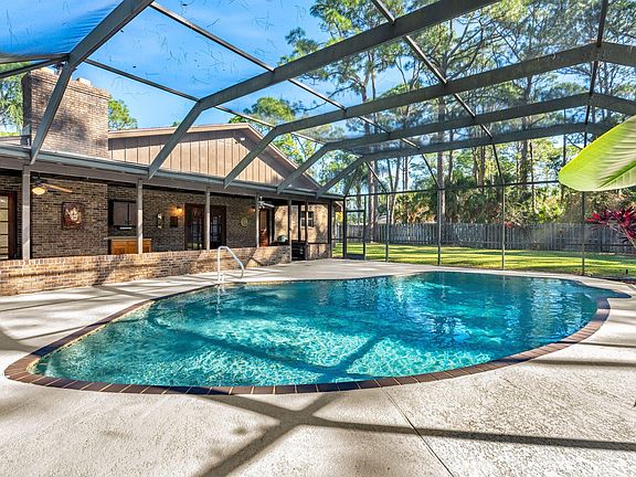 Amazing brick home with a big, solar-heated pool situated on a beautiful .65-Acre lot in Sheridan Estates! No HOA fees. Experience serenity as you relax on the 41' x 11' covered porch overlooking the screened-in pool and private, fenced backyard with majestic trees. Custom home architectural features include vaulted ceilings w/ wood beams, brick fireplace, French doors, spacious family room w/ pocket doors leading to the billiards room - the pool table is included! The formal dining room can easily convert to an office/4th bdrm. Charming kitchen w/ plant window & breakfast nook. Primary suite w/garden tub & walk-in shower. Side-entry, 600 SF, 2-car garage. 12' x 16' shed w/ electric. Recent upgrades include: new roof (2019), brand new up-to-code electrical panel & GFIs (2024), HVAC (2018), solar-powered water heater (2023), new lighting fixtures, and many more! Convenient to shopping, dining, & major employers L3Harris, Grumman, & more. Easy access to I-95. Only 10 miles to the beach!