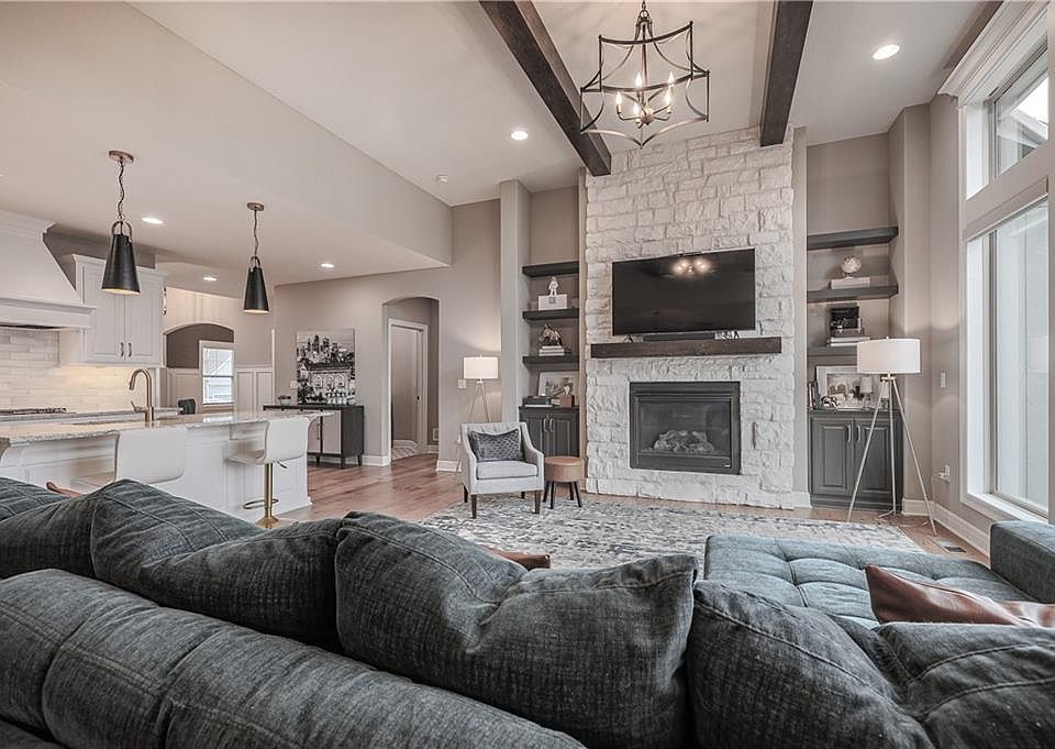 Step into this stunning reverse 1.5-story home in the highly desirable Benson Place community, featuring SAB Homes' Ellenbrook floor plan. This residence is designed for both luxury and functionality, highlighted by a unique main-level flex space perfect for a formal dining room or a home office. The owners have thoughtfully upgraded the home with a 6-foot cedar fence, a screened-in back porch, motorized shades throughout, wainscoting in the mudroom, a sprinkler system, and a radon mitigation system for added peace of mind. The main living area impresses with a floor-to-ceiling stone fireplace and wood-beamed ceilings, creating a warm, inviting atmosphere. The spacious kitchen includes a large walk-in pantry, ideal for entertaining and daily convenience. The expansive lower level offers even more room to host guests, with a wet bar, two additional bedrooms, a guest bath, and walkout patio access. The Benson Place community enhances your lifestyle with two community pools, a recreation area, a 5-acre lake, a children's splash park, a playground, scenic walking trails, and over 40 acres of parkland and natural areas. This is a home and neighborhood where luxury meets lifestyle. ASK ME ABOUT THE ASSUMABLE LOAN!