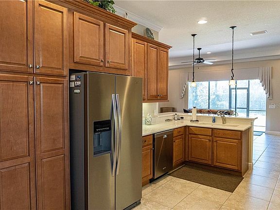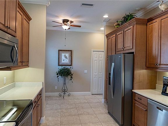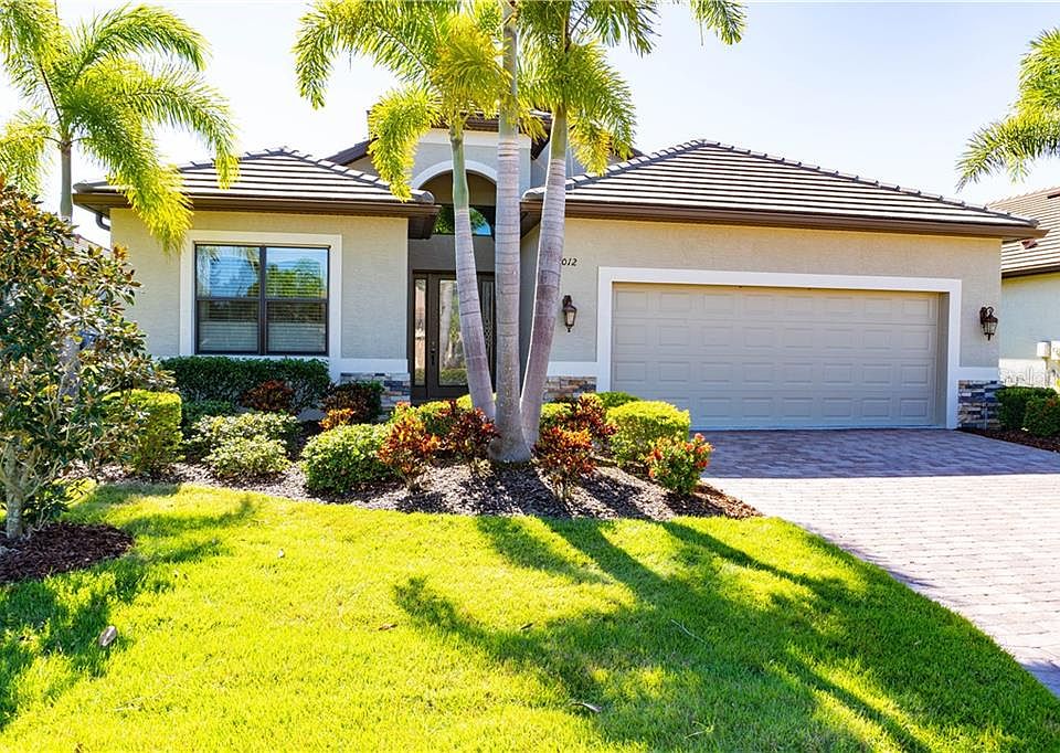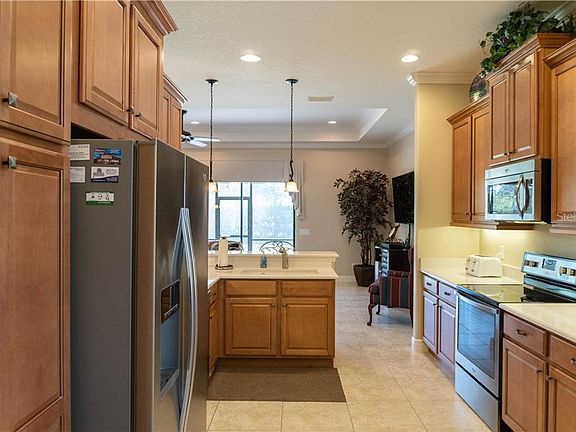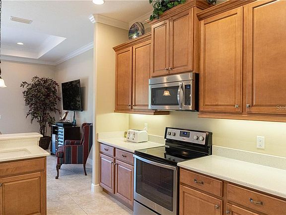 Riva Trace is a private, gated enclave of homes close to University Town Center(UTC) that has shopping, dining and entertainment. Panoramic view of the back yard from the great room, kitchen, master bedroom, and screened lanai. This well landscaped lot has a variety of bushes, a magnolia tree in front and back, and royal palms in front. Ground maintenance of your lot is included in your HOA dues. Pulling up to the home you will notice the stone detail on the front, leaded glass front door with large transom above it, paver driveway, walkway, and entry. Walking into the home you notice timeless upgrades with a Murray Feiz Chandelier in the foyer, dining area and breakfast area, crown molding through the home, high ceilings throughout the home, 20" porcelain tile, a step ceiling in the great room, upgraded light fixtures, and custom draperies. The kitchen provides the extra touch one would expect with upgraded raised panel cabinets with roll out shelves, butler pantry, and 42" upper cabinets, stainless steel appliances,quartz countertops with blanco siligranite undermount sink, and cabinet pantry and closet pantry. The open floor plan lends itself to all types of gatherings with the great room, dining room, and kitchen open to each other. Walking from the great room you have an oversized screened porch with pavers and open paver patio that overlooks a peaceful back yard with views of the landscaped area and peek a boo view of the lake beyond that. The master retreat has 2 walk in closets with closet organizers. The master bath has separate vanities with upgraded raised panel cabinets, quartz countertops with undermount sinks, garden tub,and walk in shower. Bath 2 features upgraded raised panel cabinets with corian countertop with undermount sink. Laundry room features upper cabinets and a utility sink with corian countertop and a storage cabinet beneath. For all your storage and parking needs you have an oversized garage with built in overhead storage. Garage has 18' wide garage door. Other features include a gas forced air heating system with a HALO Remy System.