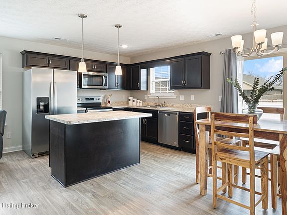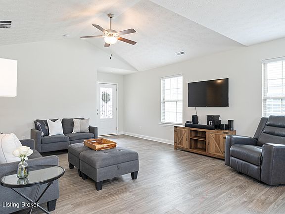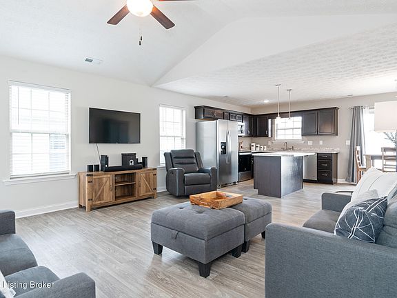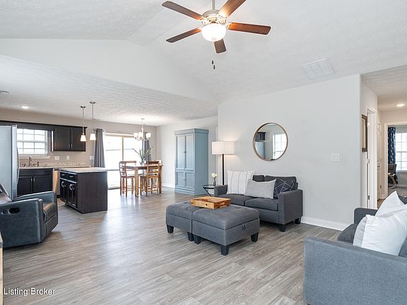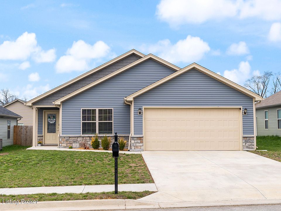 Enjoy single story living at its finest in this lovely ranch home located in the desirable Stacy Springs neighborhood. This 2021 built beauty boasts three bedrooms, two full bathrooms and an attached two car garage. When you arrive you are greeted with well landscaped shrubbery lining the pathway to the covered front porch. The entry foyer opens to the bright open concept living room with vaulted ceiling. The living room flows seamlessly into the dining area and kitchen. The kitchen boasts a large center island, shaker cabinetry, and stainless steel appliances. Off the kitchen, the dining area leads out to the patio area overlooking the fully-fenced backyard with extra storage shed for convenience. Back inside, you'll find a true Owner's Suite with tray ceiling, large walk-in closet, and en-suite bathroom. The front two bedrooms have plush carpeting, spacious closets, and a neighboring full bath and laundry room. Centrally located between Jeffersonville and Charlestown across from River Ridge, and just minutes from all the new developments featuring groceries, restaurants, retail stores and parks. Don't miss this captivating home - schedule a private tour today!