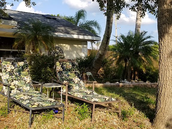 Landscaped with 3 large coconut palm trees, robellini palms, shady oak tree, fruit trees & 6 raised organic garden beds that currently producing sweet potatoes, onions, spinach, scallions, tomatoes, white potatoes, & basil. Flowering dragon fruit vines. Fruit trees...mango and citrus cocktail. Chicken coops with 2 hens (1 Americana, 1 Barred Rock) for free range eggs also completes the organic experience.