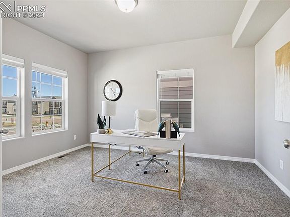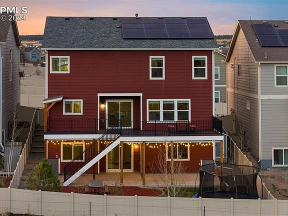 Discover your dream 6-bedroom home in Academy District 20, brimming with modern upgrades. This home boasts paid-off solar panels, a new roof, newer appliances, fresh new paint and carpet throughout makes it show like a model home. This home features a fully landscaped yard with a 5-foot vinyl privacy fence, central A/C, a whole-home humidifier, and a finished basement with a wet bar. The open concept layout and expansive outdoor living spaces are designed for both functionality and comfort. The covered porch opens to an inviting entryway with a front study featuring French doors. The interior is brightened by high ceilings and large windows throughout. The heart of the home is the gourmet kitchen with a large island, stainless steel appliances, upgraded cabinets, quartz countertops, and a walk-in pantry. The dining area fits an 8-person table, and the larger living room features a stone-surround gas fireplace. The convenient half bath and mud room finish this well designed main floor. 4 bedrooms on the upper level! Upstairs, the master suite includes space for king-sized furniture, a seating area, two closets, and a 5-piece en-suite bathroom featuring a deep soaking tub, stand alone shower, double vanity and quartz countertops. Three additional large bedrooms offer ample space w/walk-in closets. Another full bathroom w/double vanity and separate shower area and laundry room complete the second floor. The fully finished walk-out basement has two additional large bedrooms, a full bathroom, and family room with a custom-lit wet bar, leading directly out to the backyard. Outdoor areas include an expanded deck w/concrete patio, rainproof decking, under-deck lighting, and is surrounded by mature landscaping including Apple Trees, Aspens, and Ponderosa Pines. Located near shopping, dining, gyms, military bases, hiking, biking, local parks and gorgeous views of Pikes Peak- this home is ideal for convenience and leisure. Schedule your showing today.