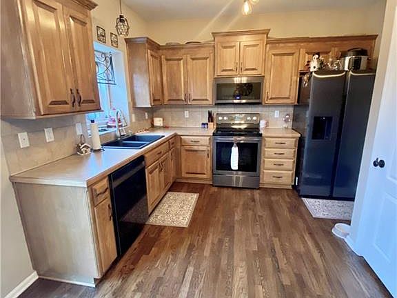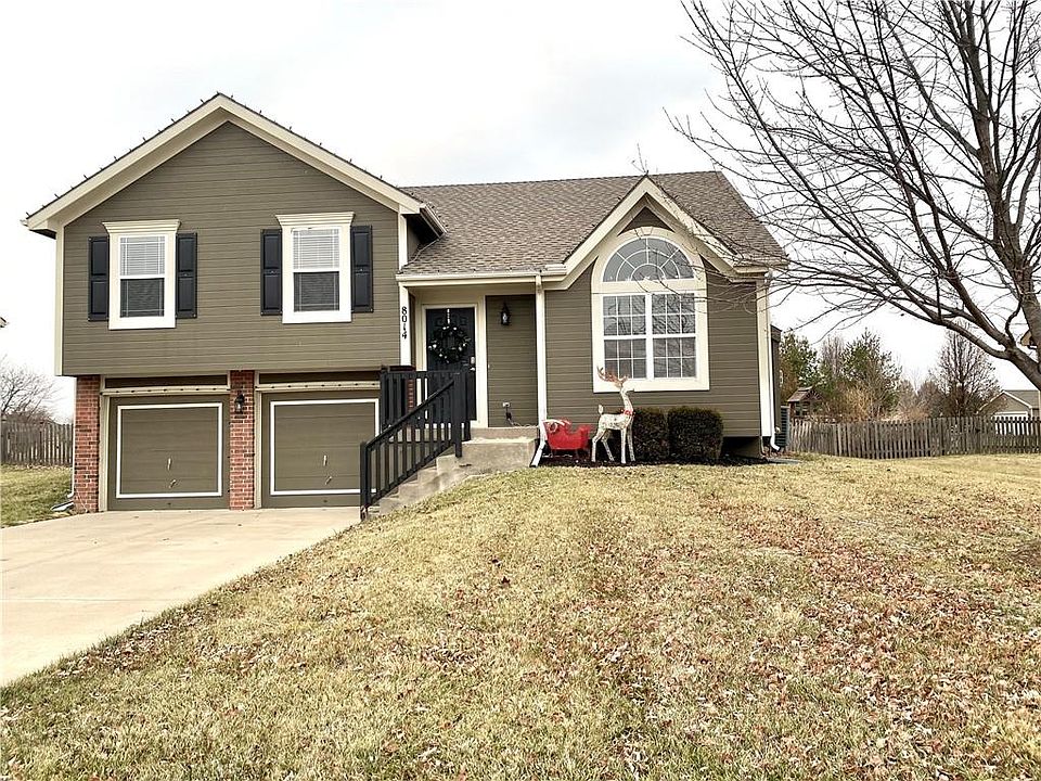 Fantastic move-in ready home! You will love the bright & airy open kitchen and living area with lots of natural light, beautiful cabinetry, with soft close drawers, full pantry, garden window, gorgeous high end hardwood flooring. We love the black stone sink & black stainless appliances! The open concept main floor includes vaulted ceilings, a electric fireplace for cozy warmth, in the living room, and lots of natural light from the tall elegant half sun front window. The kitchen/dining area walks out to the back deck. The main floor also includes the primary suite with cathedral ceilings and an ensuite with gorgeous granite vanity, shower. There are two additional bedrooms and a full hall bath on the main floor. On the lower level is a family room, fourth bedroom, third bath, storage space, and access to the attached two car garage. Huge fenced in yard that backs to greenspace, and views of back deck. deck is perfect for entertaining. Extra-deep garage, & unground sprinkler system for you to enjoy the lush green big flat yard!! Primary suite is good size and features a private bathroom and closet. Finished lower level with bath could be used as additional bonus room/bedroom. Well maintained landscaping & Fully fenced backyard. Newer roof! Close to Liberty schools and close highway access!