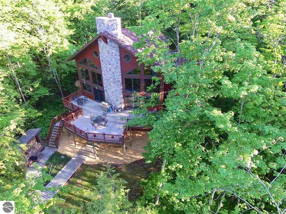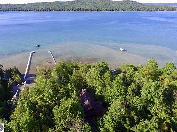 Located on the South Shore of Little Glen Lake is this stunning and unique home. Custom built with many incredible features, including extensive woodwork, hardwood flooring, soaring two-story, fieldstone fireplace, large deck, and four-season billiards room with built-in bar. With four bedrooms, three bathrooms, and additional space currently used as an office, there is plenty of square footage to gather large groups and entertain in style! A meandering walkway to the lake, beautiful views of the Sleeping Bear Dunes, and turquoise water just steps out the door make this even more appealing.