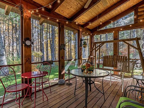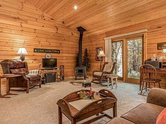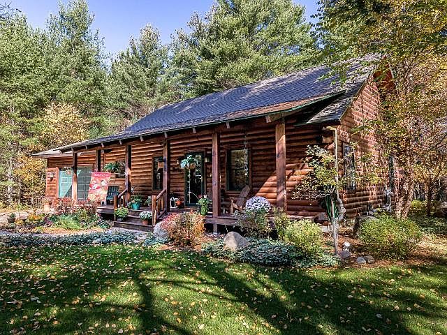 Martha Stewart would be charmed! Postcard perfection & privacy! This quality-built custom full log home was built in 2010 and sits on 4.82 acres of privacy. You'll love the winding, private driveway & professional landscaping! The covered porch is so welcoming, but there's so much more! The main level offers an open-concept living room, kitchen/dining area with cathedral ceiling, faux wood vinyl and new living room carpeting. The living room offers wood stove and a great view through the patio doors of the backyard and access to the most charming screened-in porch! There are 2 bedrooms (one of which has access to the porch as well) & a full bath, along w/main floor laundry. The lower level is finished with a family room, full bath & plenty of storage. This place is spotless & Sellers are meticulous! There's a 1+ car garage & plenty of space to build another garage. Total privacy & across from the snowmobile trail and near many lakes & trails! Welcome to your log home in the woods..