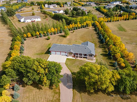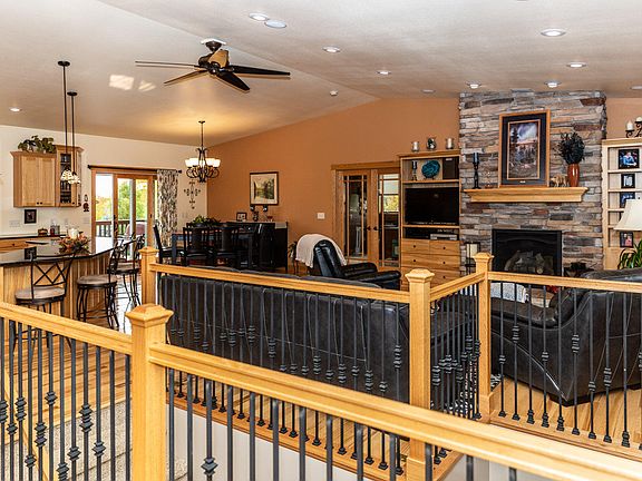 Looking for a rural home? Huge Garage?Welcome home to this fabulous Walkout ranch style home that offers great curb appeal and is situated on 2.3 acres surrounded by trees. The front porch welcomes one into this spacious home. There are hickory hardwood floors throughout most of the main level. The kitchen has lots of hickory cabinets, a HUGE CENTER ISLAND AND HUGE (cleverly hidden) walk in pantry. There are Granite counters, gas ranch and upgraded appliances. The main floor features an open concept, 9 foot walls and vaulted ceilings. The living room has a gorgeous stone gas fireplace. There is a Large covered deck off the dining area. The master bedroom suite has a master bath with dual vessel sinks, walk in closet, corner whirlpool tub, custom Haider mirrors and custom tile shower. There are sliding doors from the master leading to the huge deck that spans most of the back of the home. Off the garage is a laundry room with lots of storage and dual closets plus another walk in closet in the hall. There is a main floor office/bedroom (no closet). The WALKOUT lower level has a large family room with another gas fireplace, a pool table area and a wet bar. Patio doors lead to a patio with a hot tub (negotiable). There are 2 additional large bedrooms with daylight windows plus a full bath with dual vanity with granite. Additional features include a huge Marathon water heater with recirculating system for fast hot water, an air exchanger ventilation system, new shingles/gutters in 2017, 2- 200 amp electrical panels, Pro-foam spray insulation, an economical air to air heat pump, a sprinkler system for much of the yard (about 60 ft in back, to trees in front), and surround sound speakers in much of the home and is wired for surround sound throughout. The HUGE GARAGE has 1200 sq ft. and 3 separate doors that are super insulated, 3 floor drains, water, has 220 amp service and is totally insulated, sheetrocked, and heated. This beautiful home has it all!