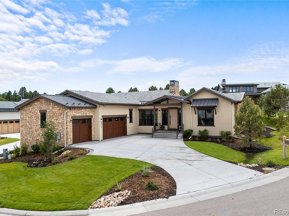 Contemporary elegance meets serene mountain living. An exquisitely designed, move-in ready, fully landscaped retreat in The Summit at Castle Pines Village. This ranch-style home combines thoughtful functionality with luxe finishes, all set on a quiet cul-de-sac. From the moment you arrive, a sense of calm takes over. Inside, soaring ceilings and wide-plank hardwood floors create an airy flow, while walls of windows bring the outdoors in. The open-concept great room centers around a dramatic fireplace and extends seamlessly to a covered outdoor living space making it easy to dine alfresco or simply unwind beneath the pines. The heart of the home is the gourmet kitchen, where high-end Wolf appliances, Quartz countertops, soft-close cabinetry, and an oversized center island invite both everyday ease and elevated entertaining. A walk-in pantry and an adjacent butler’s prep station provide ample storage and organization space. The main-floor primary suite is a private haven, featuring a spa-inspired bath with dual vanities, a freestanding soaking tub, a spacious walk-in shower, and an expansive walk-in dressing room. A main-level study at the front of the home is ideal for your executive commitments. The lower- level impresses with a sprawling rec room, stylish wet bar, and two full bedrooms with a shared bath. The space tempts fun movie nights, game days, or even easy, multigenerational living.