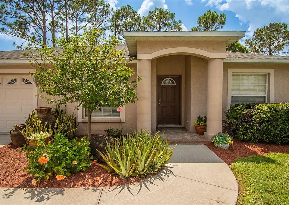 IMMACULATELY MAINTAINED 3 BEDROOM 2 BATHROOM ONE-OWNER HOME WITH NEW ROOF AND A/C ELIGIBLE FOR USDA 100% FINANCING. Fantastic family oriented split plan with 2 bedrooms on one side and the primary suite on the other. The ensuite bathroom boasts a large walk-in closet, garden tub, separate shower and dual sinks. The kitchen features recessed lighting, newer appliances, breakfast bar, ample oak cabinet storage and pass-through to the dining room. The kitchen overlooks the living room that has french doors to the paved patio and also offers access to the enclosed screen patio. Secondary bedroom has pocket door access to the guest bathroom, which could become a pool bath, with another exterior door to the back patio. This home also has a two car garage and inside utility room with shelving. Grand Pines Community offers sidewalks, community pool and playground included in the low HOA dues. Conveniently located near shopping, entertainment and I-4. Roof 2023 HVAC 2022.