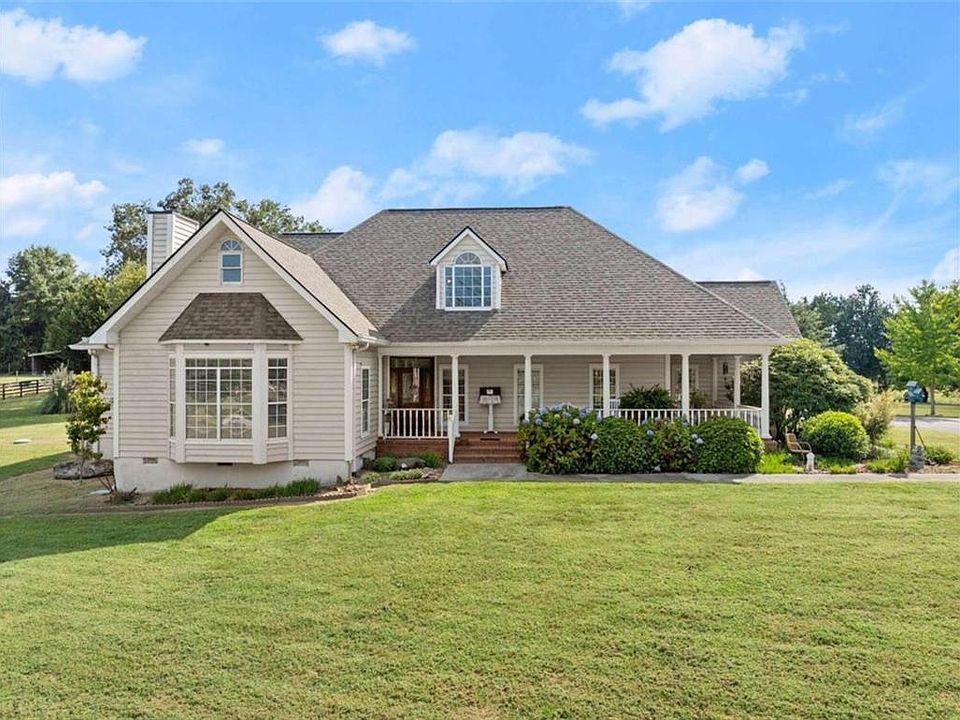 Welcome to the Southern elegance of 8016 County Line Rd in Gillsville, Georgia. Tucked away in Hall County, this custom-built 3-bedroom, 4-bathroom home spans almost 5 acres of serene countryside. The home's thoughtful design includes a split floor plan, with the master suite on one side and two additional bedrooms on the other, separated by a spacious kitchen, sitting room, living room, and sunroom. Upstairs, you'll find an extra full bathroom, a bonus room, and plenty of storage space. The master suite is a standout feature, offering his and hers FULL bathrooms for ultimate comfort and privacy. The property embodies the essence of country living, with flat, fully usable land, a barn/garage with a finished side room, and a covered bay shed for vehicles/equipment. The side yard, which once served as pasture for cattle, offers endless possibilities. As you approach the home, a driveway lined with mature trees guides you to a charming front porch with blooming hydrangea bushes, creating a warm and inviting entrance to this countryside retreat.