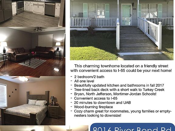 Cozy townhome conveniently located in Morris, just off of I-65! This townhome was updated in the fall of 2017 and features a great one-story layout with two-bedrooms each with their own private or semi-private bath. Great for roommates, empty-nesters looking to downsize or a young family. Zoned for desirable Bryan/North Jefferson/Moritmer-Jordan schools! Only 20 minutes to UAB! Includes back deck with wooded yard a short walk from Turkey Creek. For rent or sell by owner. Contact Will for more info. Tennant responsible for all utilities. Renters will go through background and credit check as part of the application. Small pets may be considered for an additional fee and breeds and numbers of pets will be approved in writing.