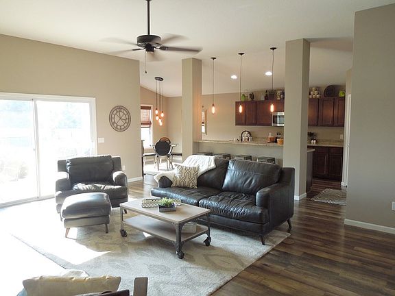 WOW, open the door and see the pond lot, with metal fencing, oversize patio (22x16) and covered porch. This 1616 sq ft immaculate ranch features laminate wood flooring in foyer great room, Kitchen and breakfast nook. Large pantry in kitchen with all appliances (including washer and dryer), bar area, all open to Great room with tall ceilings, stone fireplace and TV above. Master bedroom has walk in closet, double sinks, and shower plus a double trayed ceiling. The 2nd bedroom has another attached TV that remains. Impressive yard and all on cul da sac lot.