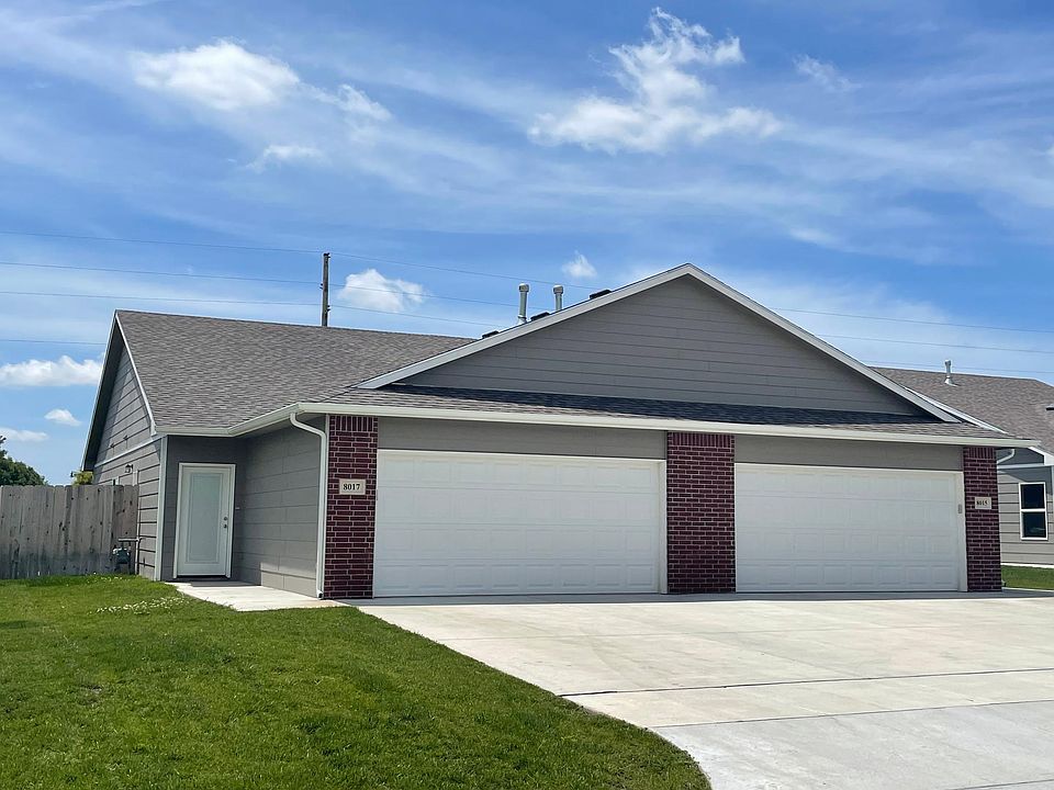 2 Year Old Construction Duplex less than 1/2 mile from McConnell AFB main gate. 3 bedrooms and 2 bath with 2 car garage. Granite counter tops in kitchen and bathrooms. Pets allowed based on size and number and a non-refundable $200 pet deposit. Derby schools, stained concrete floors, yard mowing and maintenance provided by neighborhood. Call me for a showing or if you have questions. No Section 8. Grass and yard maintenance provided by HOA