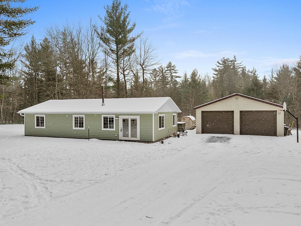 The ultimate, secluded cabin in the woods! This beautifully remodeled 3 bedroom, 2 bathroom home is tucked away on 12 acres surrounded by state land. The spacious kitchen is a standout, featuring a stunning 8-foot granite island- perfect for both cooking and entertaining. You'll appreciate the large master suite complete with a 6x5 walk-in closet and en-suite bathroom. This home has been thoughtfully renovated, which includes new plumbing, new forced air furnace and a new roof. Enjoy ultimate relaxation with the outdoor sauna and hot tub, perfect for unwinding after a long day. A large 30x50 heated garage provides plenty of space for storage or projects. Whether you're looking for a peaceful retreat or a family home with modern upgrades, this property has it all. This property is landlocked, traveling through state land to access the home, therefore cash only.