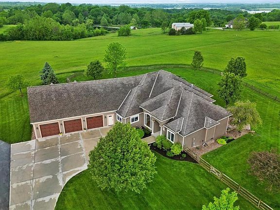 Back on the market due to contingency expiring, no fault of the seller. Beautiful, newly renovated home on just over 30 acres with outbuildings, including a work shop with separate storage and a dedicated horse barn with dry lot and pasture that is fenced and cross fenced. The house is situated on a quiet dead end road near Smithville Lake in the Kearney School District with easy access to miles of horse trails along Smithville Lake. Serene feeling of an oasis while being just minutes from Kearney, Smithville and Liberty as well as all of the recreational amenities Smithville Lake has to offer with easy access to I-35 and the new Kansas City Airport. The home features newly finished hardwood floors, updated paint and new carpet throughout. The large kitchen and eat-in dining area looks out over acres of property with its own pond and a working windmill. There is also a formal dining area and living room with a see through fire place with lots of gorgeous woodwork throughout this high end luxury home. The master suite with huge walk-in closet is on one side of the home and two additional bedrooms with bathroom on the opposite side of the house as well as a half bath for guests. There is a dedicated laundry and mud room just off the three stall garage with a separate dedicated office for privacy. There is also a bonus room above the three stall garage with its own bathroom/shower and separate entrance directly from the garage. Heading downstairs there is a large family/game room with a full bar including a full size refrigerator, sink and dishwasher. Off to one side there is a dedicated theater room and on the other side there is an additional bedroom with a huge walk-in closet with its own door to the beautiful and private patio with a fire pit and a built in BBQ peninsula. The downstairs bathroom is huge and boasts a full steam shower with lounging area. There is plenty of storage options, both finished and unfinished as well.