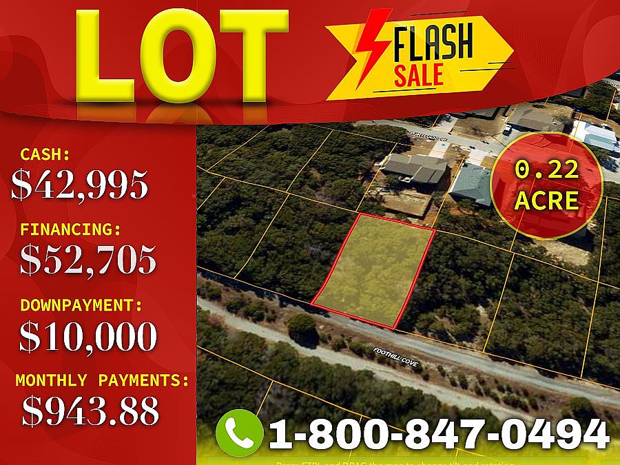Unbelievable 0.22-acre Property selling BELOW MARKET VALUE This GREAT Deal is just a phone call away! —------------------------------------------------------------------------------------------------------------------ If you're looking for the ideal place to raise a family with great schools and an affordable cost of living, nice weather, and a generally friendly community, then this property is the PERFECT one for you! This lot is located in the thriving suburban city of Leander in Travis County. It is your typical suburb with all the amenities you need minus the noise and stress. It is a developing city conveniently close to Austin, allowing you to partake in its entertainment, outdoor activities, shopping & dining, but far enough to avoid its hustles and bustles. The property sits in mostly wooded lots with a few houses scattered across the area. In spite of it being a small growing town, there are surprisingly lots of exciting places to go to in Leander. The closest one is Sunset Deck in Marble Falls just 3.8 miles from the property where you can enjoy the spectacular views of Lake Travis and the valley. Just a 28-minute drive away is the Lake Travis Zipline Adventures. Have lots of fun hiking and ziplining with your family and friends. The whole of Travis County is dotted with plenty of amazing spots of a similar kind. On the lookout for awesome food hunts? Sonic Drive-In might become your go-to fast food chain as they're only a 5-minute drive away. Their tasty hamburgers and delicious strawberry milkshakes are definitely a must-try! When you’re in the mood for a hearty breakfast or some great Texas Philly Cheesesteak, Lago Bistro is the place to go! This property is a residential lot for single-family homes. The road leading to it is paved and the area has electricity service. Their water supply is being provided by a public water system and sewer is available. Did I mention that we offer NO CREDIT CHECK PAYMENT PLANS with most purchases? That’s right, you do not need to secure an outside funding source – See purchase options below for more details. This vacant 0.22-acre lot is located in the city of Leander in Travis County, TX. If you want to view the property you can put the following address or coordinates on Google maps or your phone: 30°28'54.5"N 97°58'54.8"W The Market Value for this BEAUTIFUL lot is $67,000 based on recent property sales in the area. And we are selling it at $42,995!!! (You save $24,005) Our research showed that this property would be perfect for your mobile home and dream home. We are currently offering 2 options to purchase this LOVELY property. Buy it Seller Financed at $52,705 with an $10,000 Down Payment and $943.88 monthly payments for 36 months to suit your needs. Or CASH PRICE: $42,995 Disclaimer The buyer is responsible for verifying all information with the County as to what can and can't be done with the property. Buyer will need to work with the County to obtain the proper permits if needed. Buyer will also need to confirm the availability of any utilities needed or serviced on the property. Seller makes no warranties or representations about the land, its condition, or what can be built on the property. Interested? Call Fierce Six, Inc at 1-800-847-0494 Property Type: Land Sale Price: $42,995 Financing: $52,705 Downpayment: $10,000 Monthly payments: $943.88 State: TX County: Travis APN (Assessor's Parcel Number): 184780107 Size: 0.22 Acres Property Address: 8018 Foothill CV, Leander, TX, 78645 Market Value: Similar lots in the area are selling for $67,000. Get this property now for $24,005 below market value... Own it today for just $42,995 Don't have the cash? We also offer owner financing -- no credit checks required! Note: We also may have other property at bargain prices just like this available - ask us when you call!