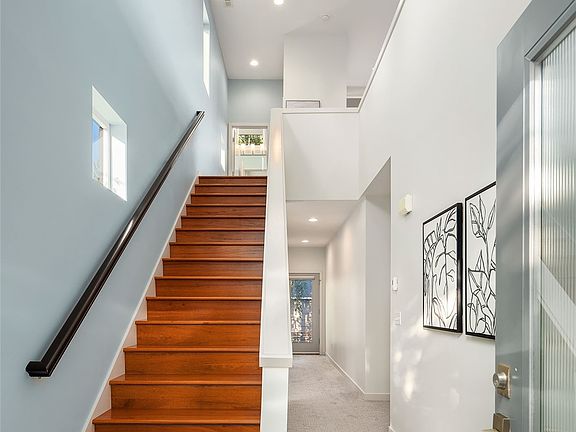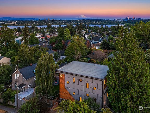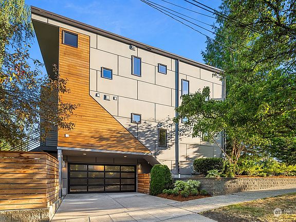 Watch the sunrise while sipping your morning coffee from your urban treehouse with sweeping views of downtown Seattle, Mount Rainier, & Green Lake. This Greenwood neighborhood contemporary home, on a corner lot, is perfectly situated for commuting, recreation, & city living.  Upper floor is adorned with floor to ceiling windows & maximizes the fantastic view. Open concept living on the upper floor exudes entertaining & gourmet cooking. The main floor consists of a generous primary bedroom with en suite bathroom & two walk-in closets; two additional oversized bedrooms; & laundry.  The basement level has an office space, the bonus room is a large 4th bedroom with Murphy bed & built-in closet or media room.  Do not miss the huge 2 car garage!