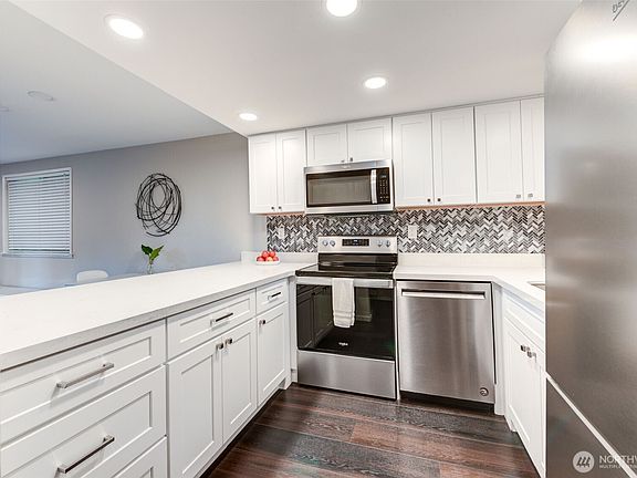 This quiet end unit offers rare privacy with only one shared wall. It is the last building in the complex providing peaceful setting yet close to transit , shopping, restaurants and Edmonds CC. Beautifully remodeled throughout: newer kitchen cabinets, stylish tile backsplash, quartz countertops and SS appliances . Durable vinyl plank flooring , updated bathrooms , fresh paint and cozy fireplace with tile surround. Enjoy your private deck overlooking the courtyard in a well- maintained community.