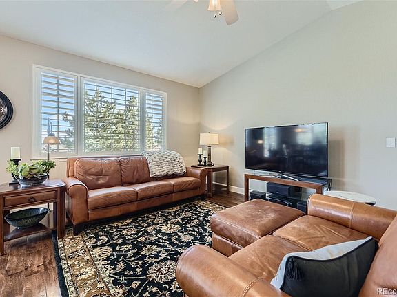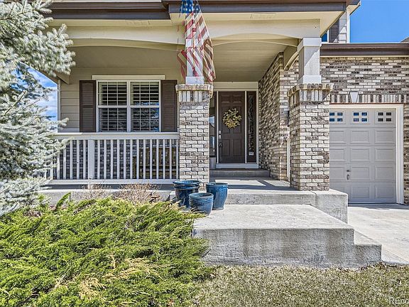 Step inside this 5-bed, 4-bath home and be greeted by a wealth of designer touches and meticulously crafted spaces, ideal for both entertaining and relaxation. The main floor is welcoming of an open living floor plan, complete with a cozy dining nook. The kitchen, a chef's delight, features 42" Solid Maple Cabinetry, granite countertops, and top-of-the-line stainless steel appliances including Bosch refrigerator & dishwasher. Designed to elevate your culinary experiences a double oven and gas cooktop are included. Unwind in the spacious living room by the gas fireplace including a built-in AV media bookcase. An elegant dining room sets the stage for memorable gatherings and holiday celebrations. Retreat to the luxurious Primary bedroom, boasting a 5-piece vanity, oversized soaking tub, and two walk-in closets, promising a serene escape after a long day. The main floor exudes elegance with hickory wood flooring, plantation shutters lofty 9' ceilings, along with 2 spacious bedrooms. A finished basement offers ample space for leisure and recreation. Discover two bedrooms, a well-appointed bathroom, and a built-in wet bar, ideal for entertaining guests. A large double drywalled and insulated media/exercise room is perfect for movie nights or intense workout sessions. Practicality meets convenience with ample storage, linen closets, wired for surround sound, central air, and a whole house humidifier. Step outside to the backyard oasis, backing to a greenbelt with a fenced-in yard and generous covered porch. Beautiful brick exterior. Mature trees, give the perfect backdrop for outdoor relaxation and entertaining. 3-car garage is equipped with 12' ceilings, shelving, 8' garage doors, and 220v service, with space for your vehicles and hobbies alike. All appliances, including washer/dryer, are included for added convenience. Don't miss this opportunity to own a slice of Colorado paradise, where comfort and practicality converge to create the perfect place to call home.