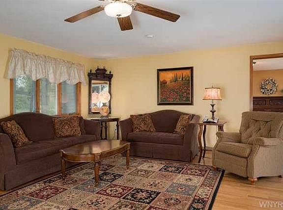 Enjoy stunning panoramic views and every changing views of 2.5 acres with pond. Living and entertaining are easy with a home that's designed for practicality flow, light, views and beauty. "First Floor Master Bedroom" with sliding patio door, wrap around deck, large eat in kitchen open to living room with custom fireplace and dining room all over looking back yard, pond and million dollar view. Finished walk out basement with 10x30 game room. Windows and roof recently updated. Square footage doesn't reflect walk-out basement. ORCHARD PARK SCHOOLS. Welcome Home!!!